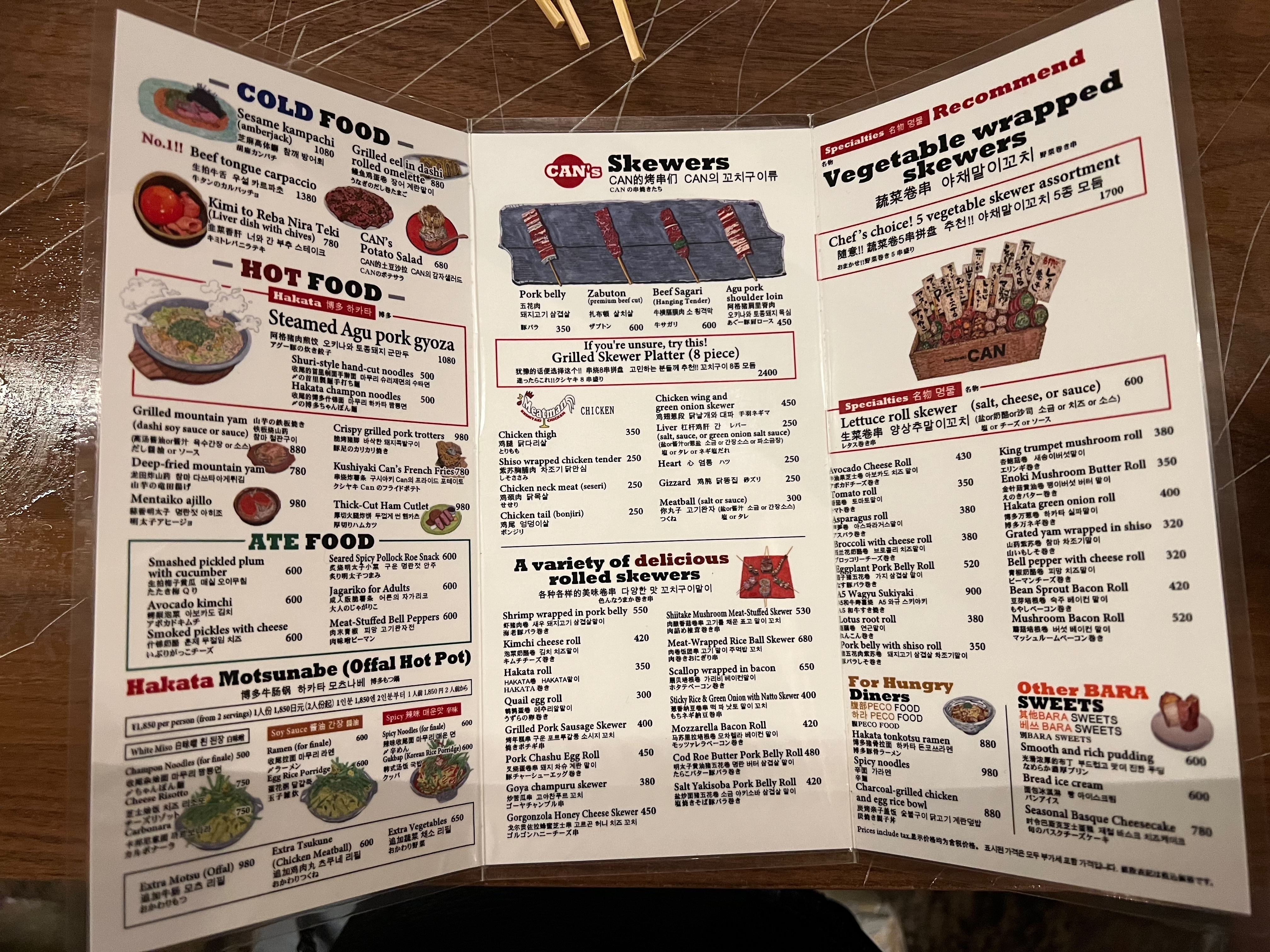 《Kushiyaki Can》主打博多風串燒,同時也有熱食、冷盤、拉麵、餃子、火鍋等豐富選擇。價位大約落在¥400~¥1300左右(約台幣80~250元),火鍋和主食類約¥1000~¥1500。菜單上有中英文,圖片清楚可愛,對外國旅客超級友善。