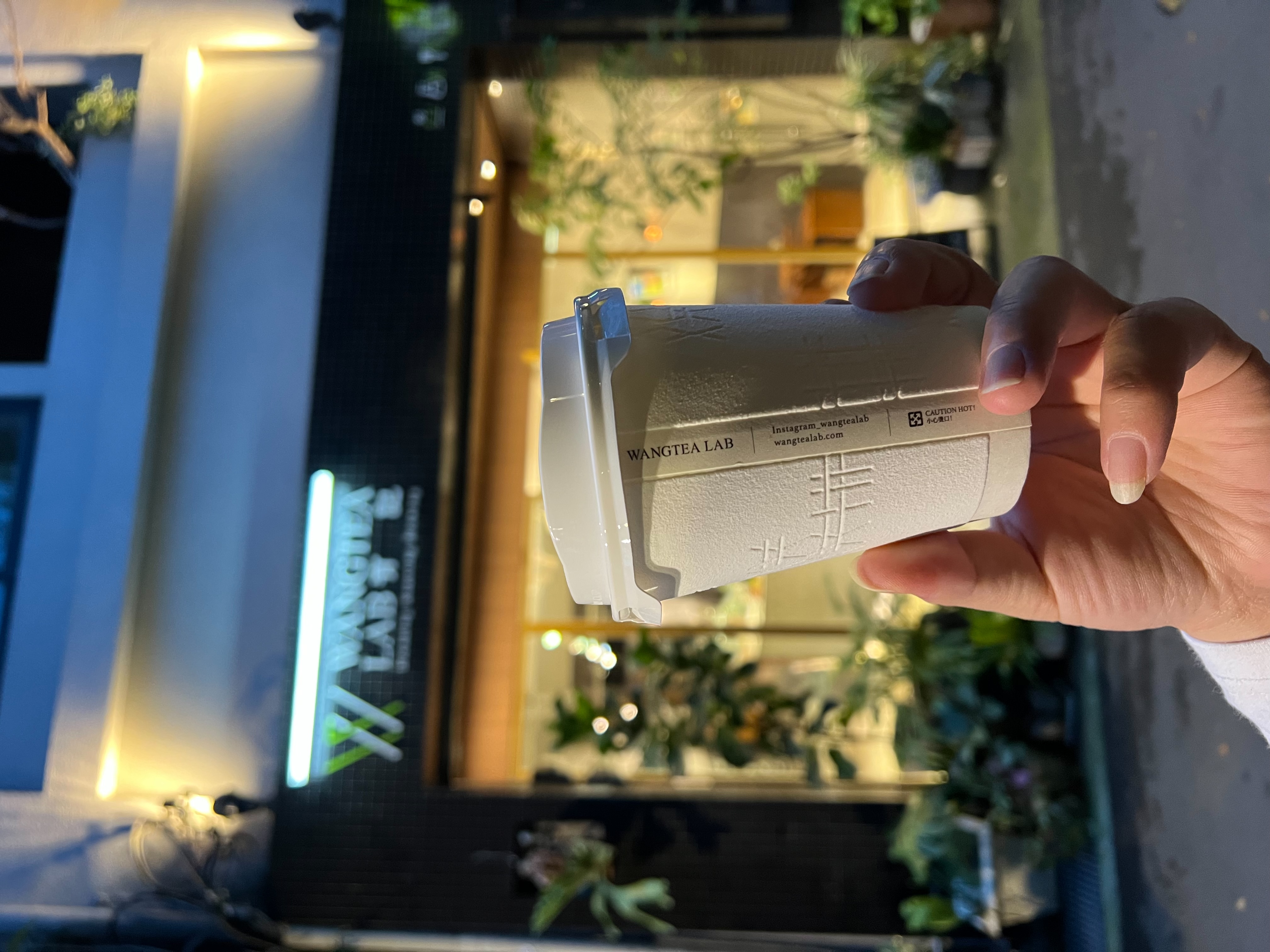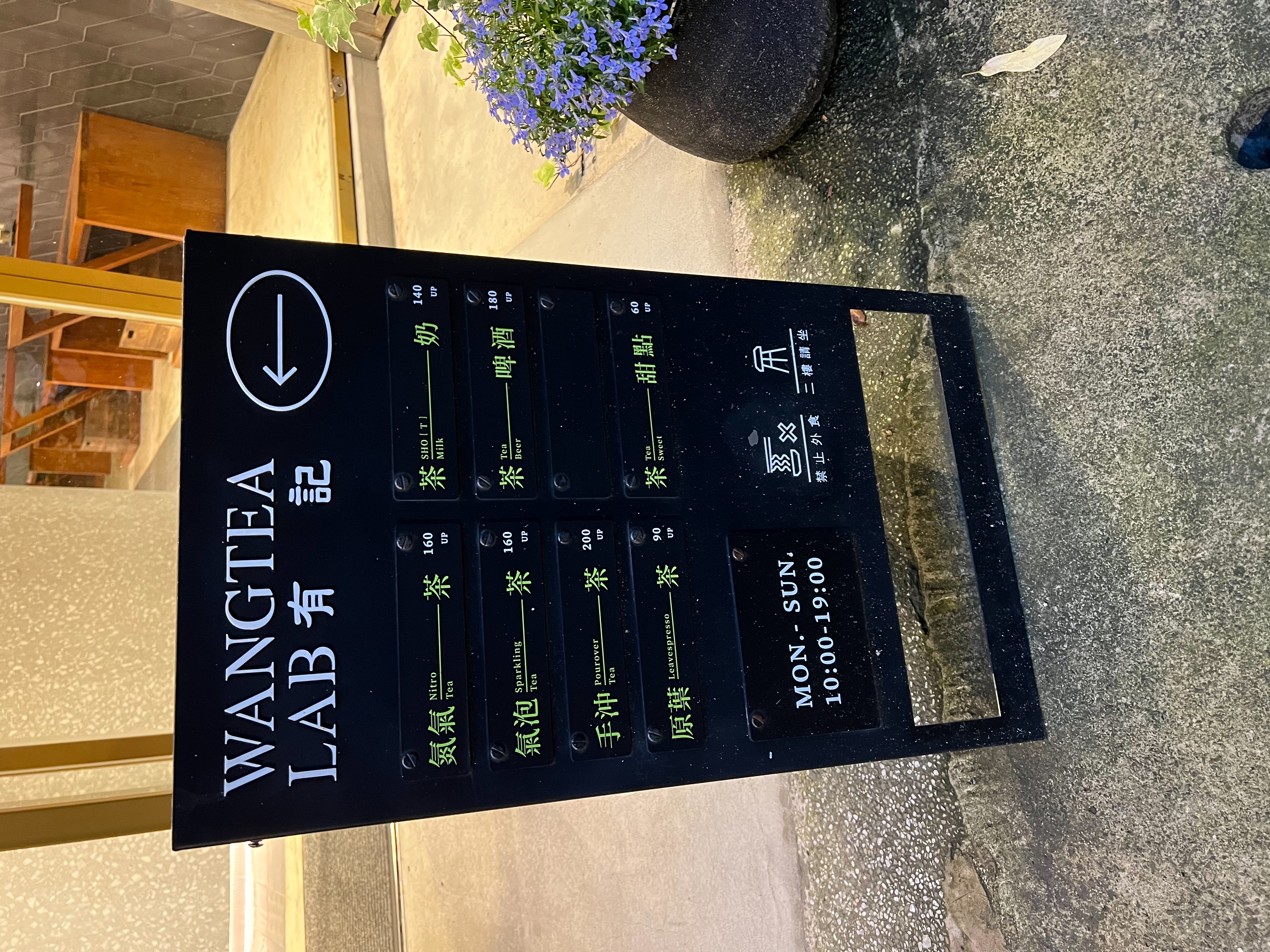 那天本來只是陪小孩在對面公園散步,看到對面有一間很亮、很乾淨、氣質很不一樣的店,走近一看,是一間叫作 《Wangtea Lab 》的小茶館。外觀以深色磁磚搭配大片落地窗,內部的金屬線條、暖黃燈光和綠植點綴,不是網美咖啡廳那種誇張的美,而是一種乾淨純粹、很有品味的氣質。