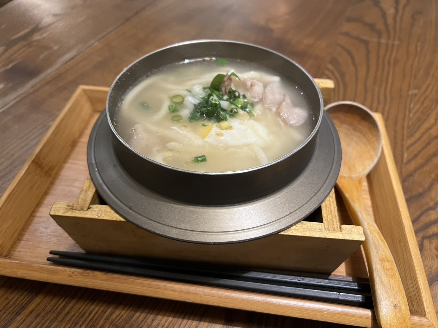 這碗的湯頭是清爽派,喝起來有高湯的甘甜,越喝越順口,松阪豬切得剛剛好,咬起來脆彈,油脂不會太重,很適合配清湯。烏龍麵偏Q,有吸到湯汁,所以吃到最後也不會太淡。整碗味道乾淨、舒服,是那種天氣熱或胃口不大時會想點的類型。