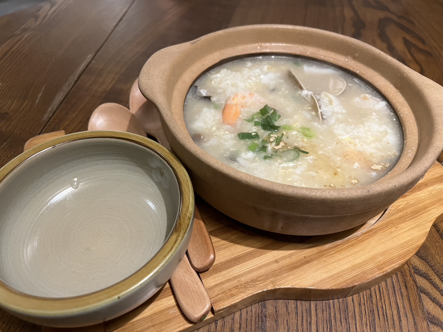 粥的濃度介於台式與廣東粥之間,吃得到米粒感但湯底也有一定稠度。海鮮味蠻明顯的,蛤蜊和蝦的鮮甜都喝得出來,溫潤舒服、不會膩,如果是早午餐或想吃點不負擔的,這碗滿適合。