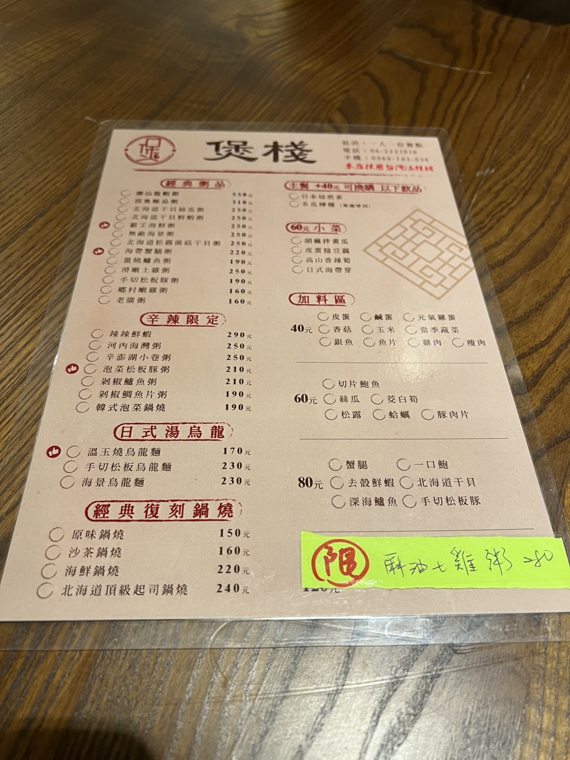 煲棧的菜單不算多,但選項滿剛好,主力是粥品系列:海鮮、鮮魚、雞肉等,走溫和細緻的湯粥風味,單道均價約$200多元左右;也有烏龍麵與鍋燒麵的選項,另外無論粥麵也可另外加購加料客製化。