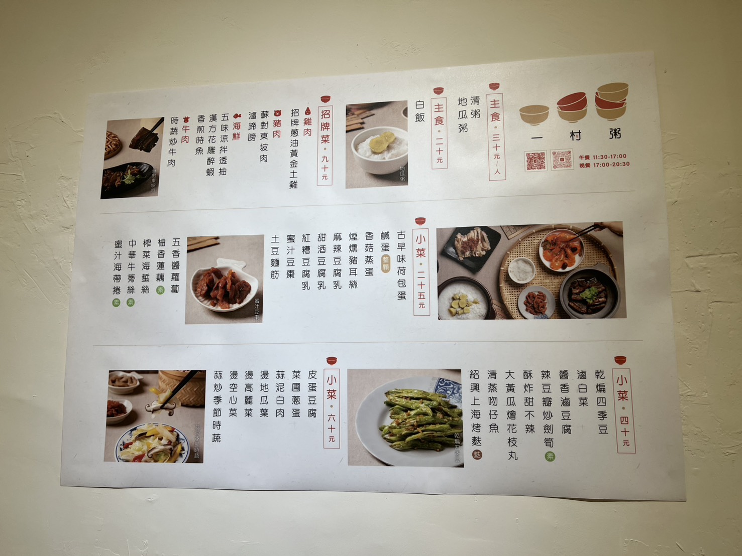 《一村粥》的菜單走的是平價又多樣化的路線,分成 25元、40元、60元、90元 等幾個區間,想吃多豐盛都可以自己搭配。平均一個人花個百來元,就能吃到一桌滿滿的清粥小菜。現場也有提供免費茶水,整體氛圍很輕鬆,完全就是可以常常報到的餐廳。