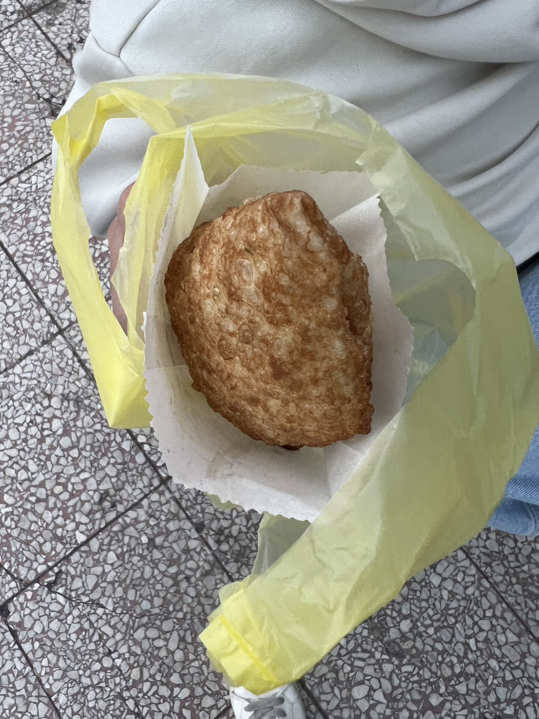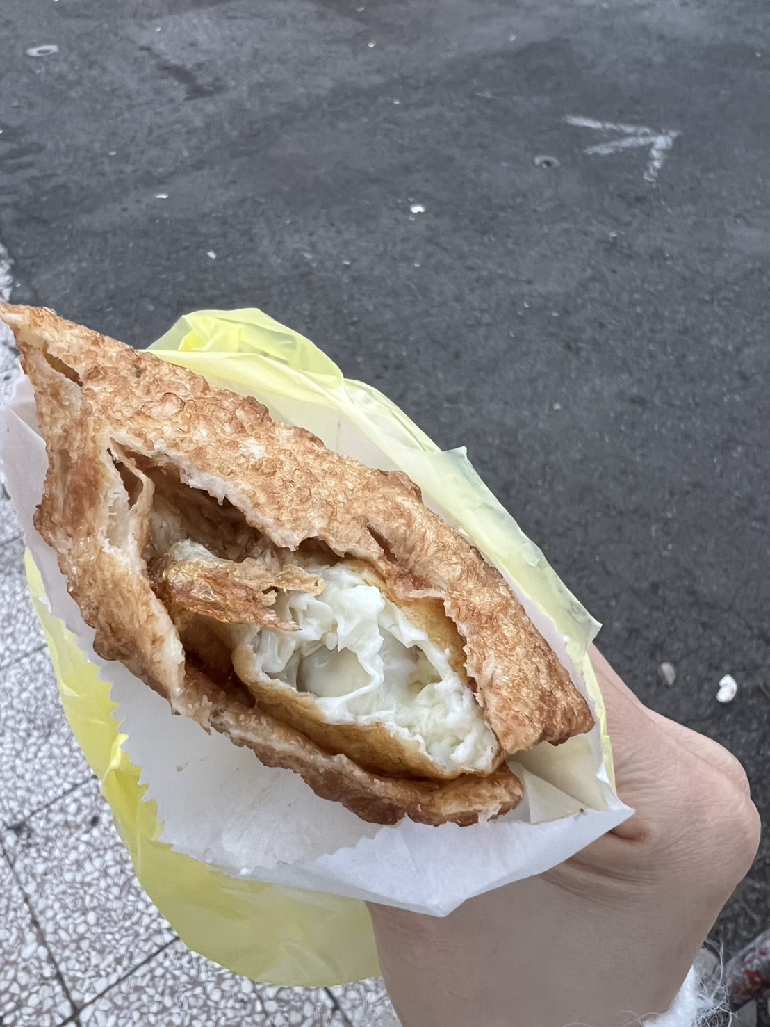 我當天點的是蒜味醬油炸彈蔥油餅,外皮炸得非常酥脆,咬下去會有明顯的「喀滋」聲,餅皮帶點空氣感,不會油膩厚重。裡面包著半熟蛋,蛋黃微微流動,和蒜味醬油融合在一起,鹹香味很夠,整體吃起來簡單直接。