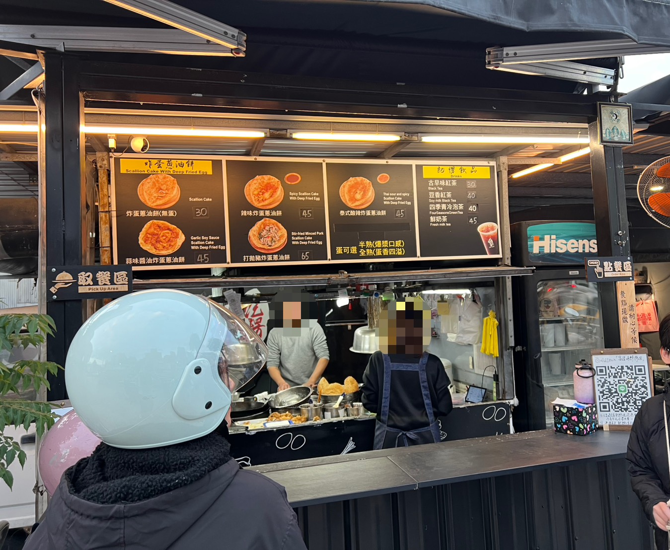 一開逛就先來《記愣蔥油餅》開吃! 之前就在網路上看過不少人推薦,是紅滿久的一家炸彈蔥油餅,現場是半開放式攤車,老闆熟練地煎餅、打蛋、炸到金黃,節奏很快。《記愣蔥油餅》主打的就是「炸彈蔥油餅」系列。主要是幾種不同口味的蔥油餅搭配蛋:原味、蒜味醬油、辣味、九層塔與打拋豬,最便宜$30~ $65之間。另外也有飲品選擇,例如古早味紅茶、四季青茶、鮮奶茶等,整體價位在現在夜市來說算滿親民的。