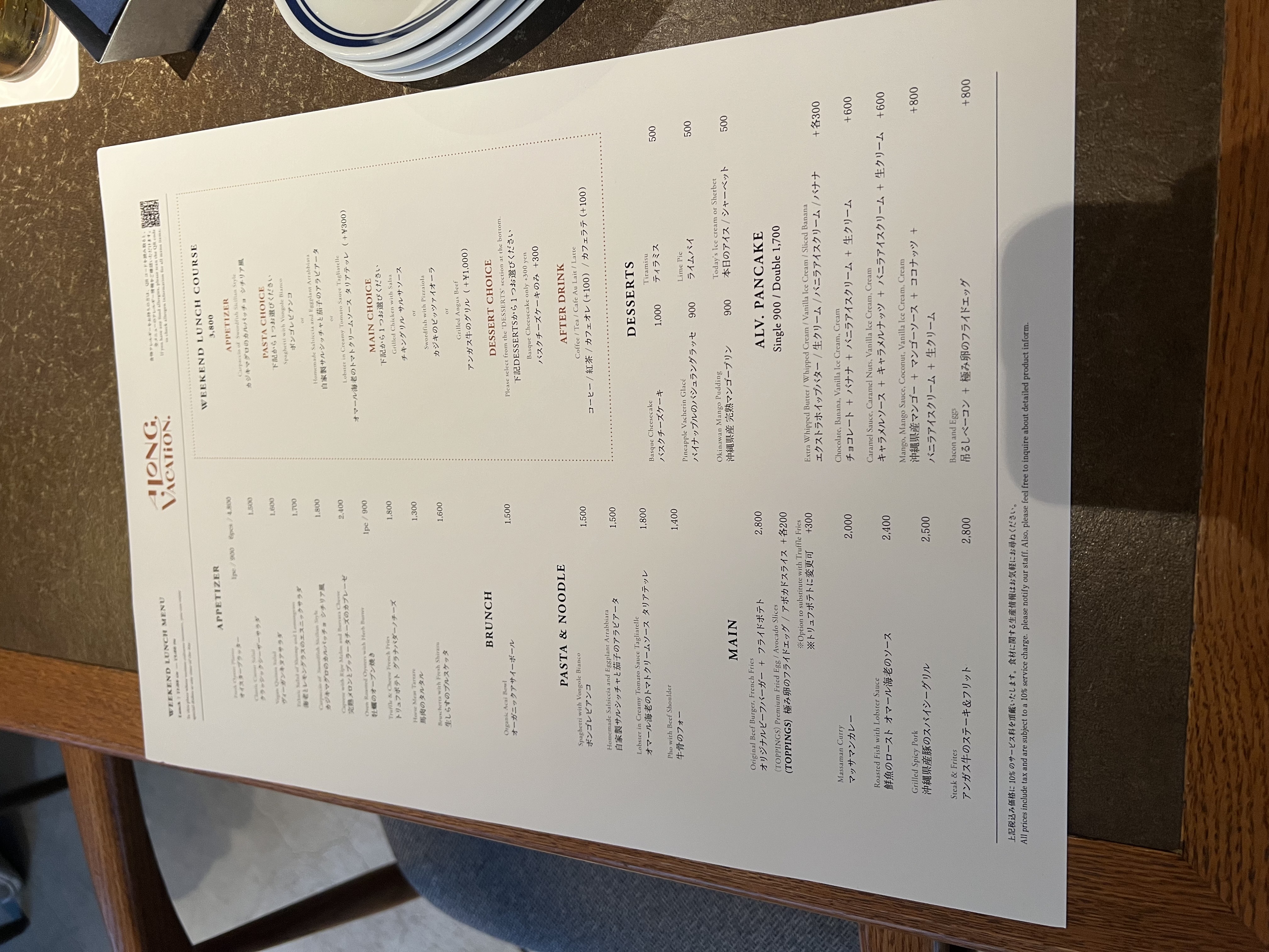 《A long vacation》營業時間從早到晚,所以菜單也挺多元的,以義式料理為主,包含開胃小菜、義大利麵、早午餐與鬆餅甜點,還有咖啡、調酒與茶飲。價位約 ¥900~¥2000 左右,飲品約 ¥500 起。