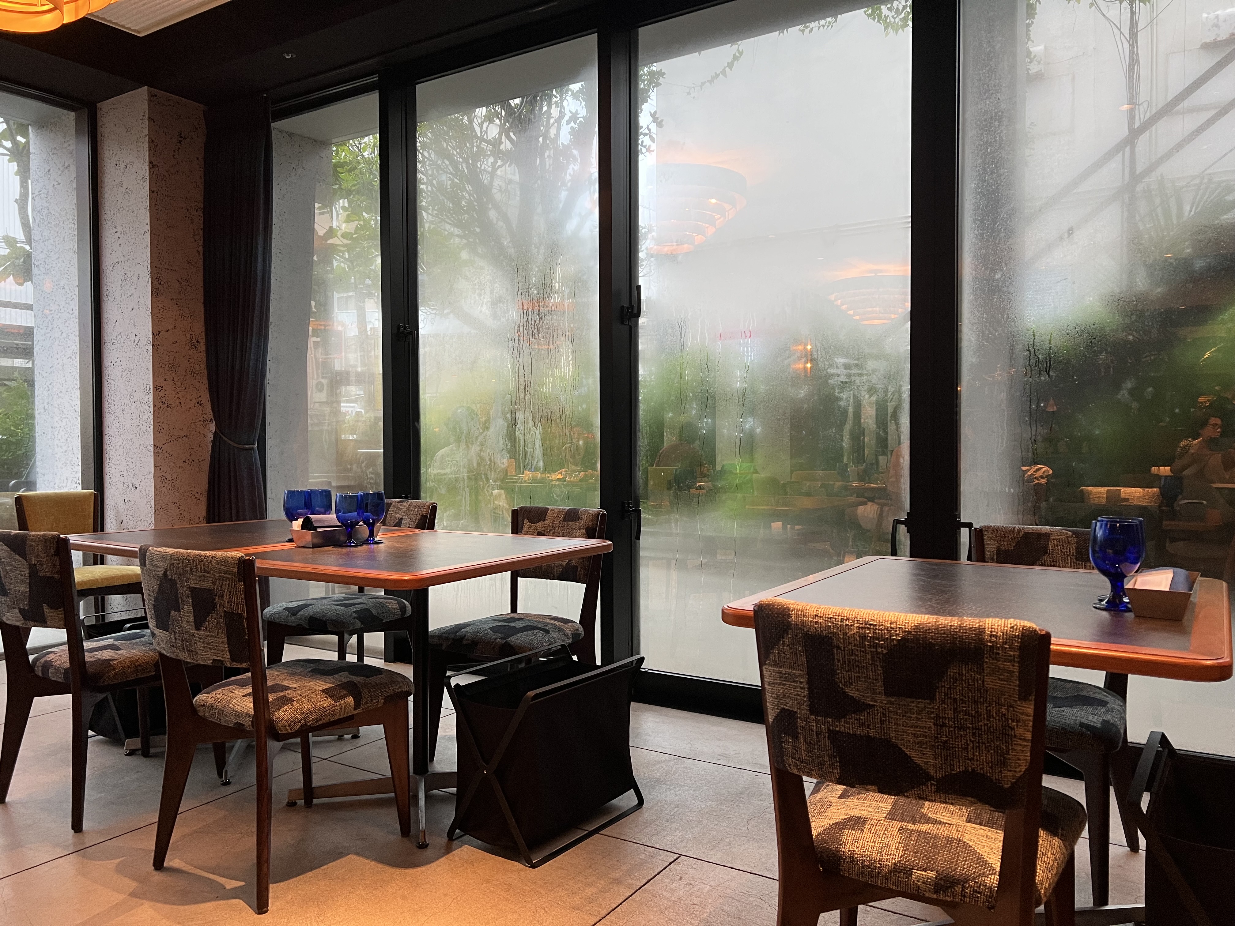 整間店採用木質桌面搭配低彩度布椅,窗邊還能看到一片綠意。雨天的玻璃微微起霧,配上柔和燈光,氣氛超放鬆。不論是想坐下來聊聊天、或是享受一個人午後時光都很合適。連服務人員都非常專業又有氣質,笑容自然、動作俐落,整體感覺真的像在五星級酒店用餐。