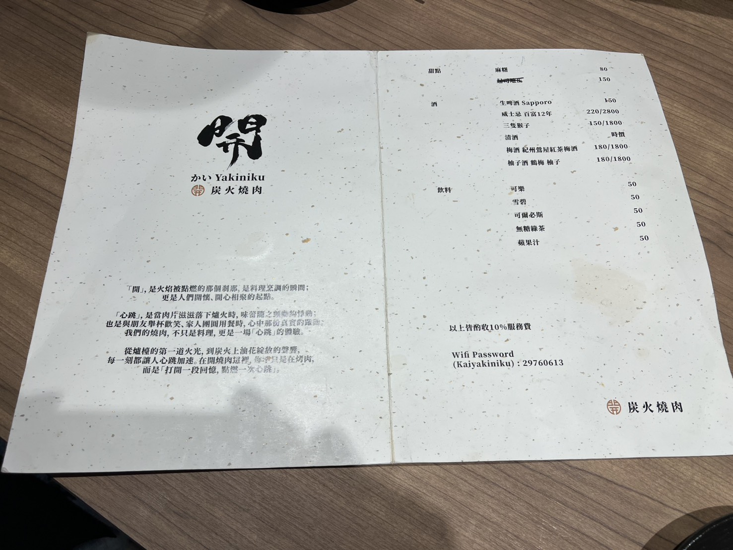 《開燒肉 》屬於精緻型的日式單點燒肉,菜單品項不算多,但每一項都走「挑過的品」路線。整體消費大概 一人 $500~$800(看點肉的量而定),在三重燒肉界算是偏中高價格,但以品質來說我覺得合理。