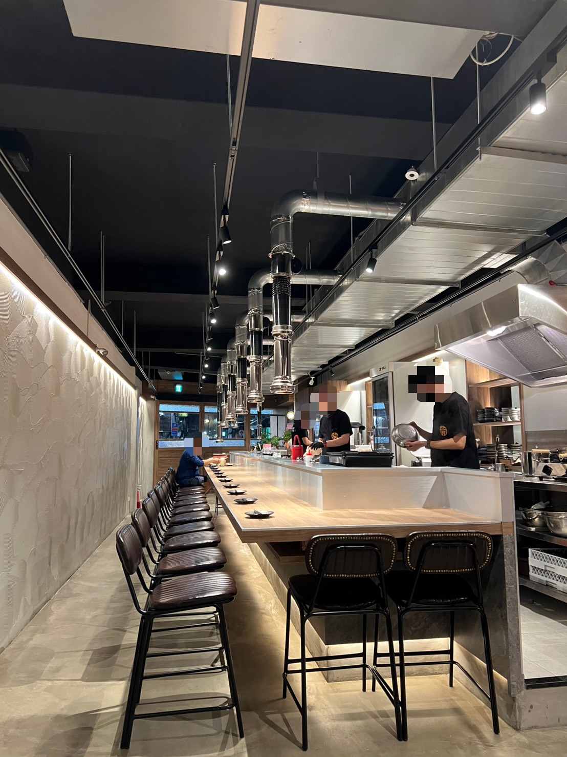 店內裝潢走木質×灰色調的簡約風,整體非常乾淨、明亮,也比想像中更舒適。桌距不會太近,用餐起來完全不擁擠。