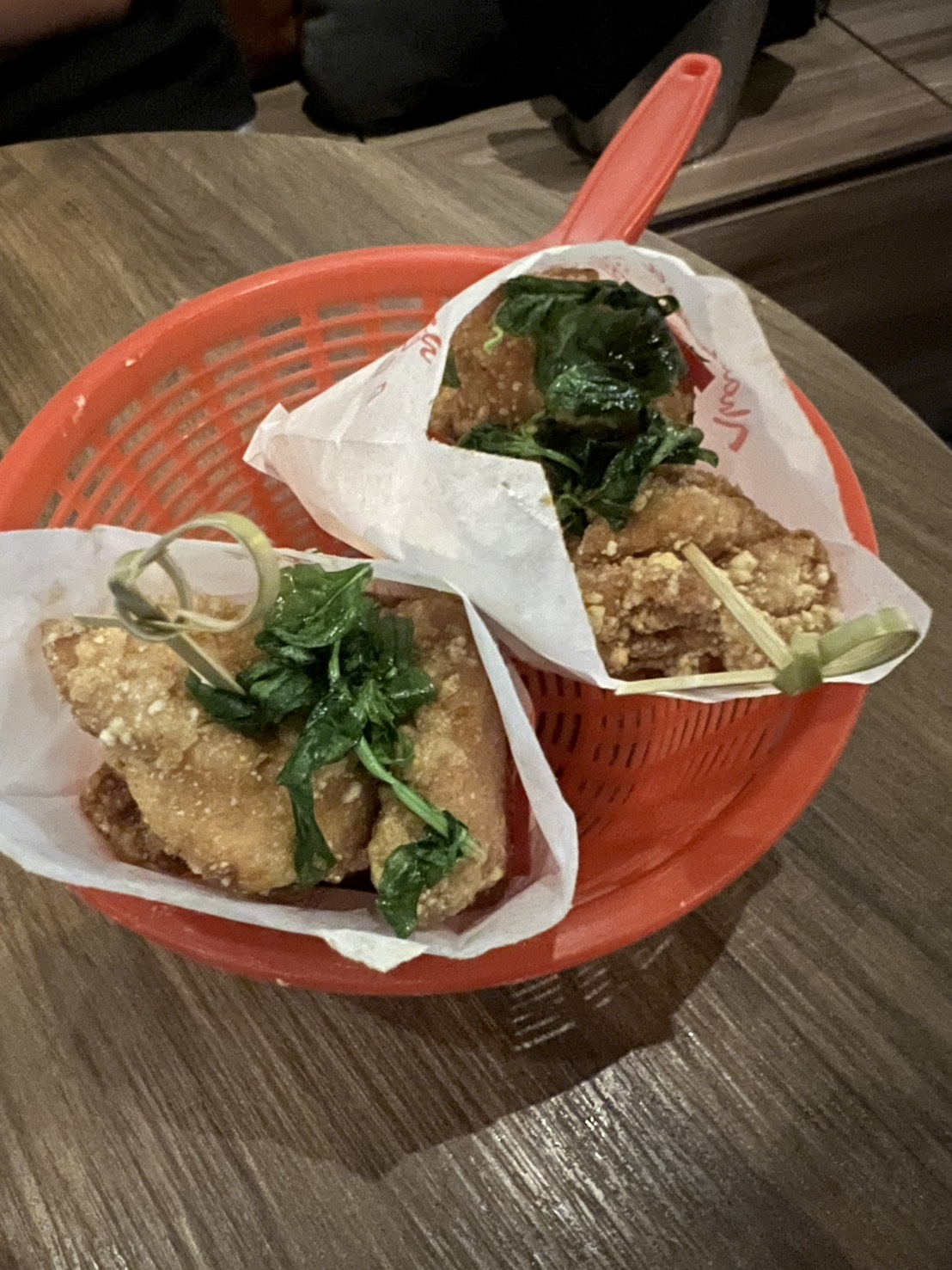 這道菜光外型就成功吸引注意力!他們不是拿一般盤子,而是用紅色鹹酥雞攤的掛籃端上來,超級復古又可愛。而且味道真的就是有「老派鹹酥雞」的影子,裡面雞肉紮實不乾、炸衣脆但不厚。