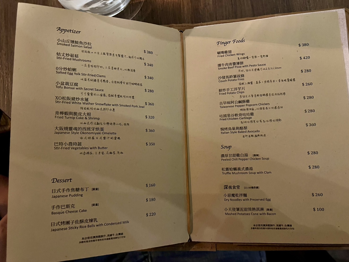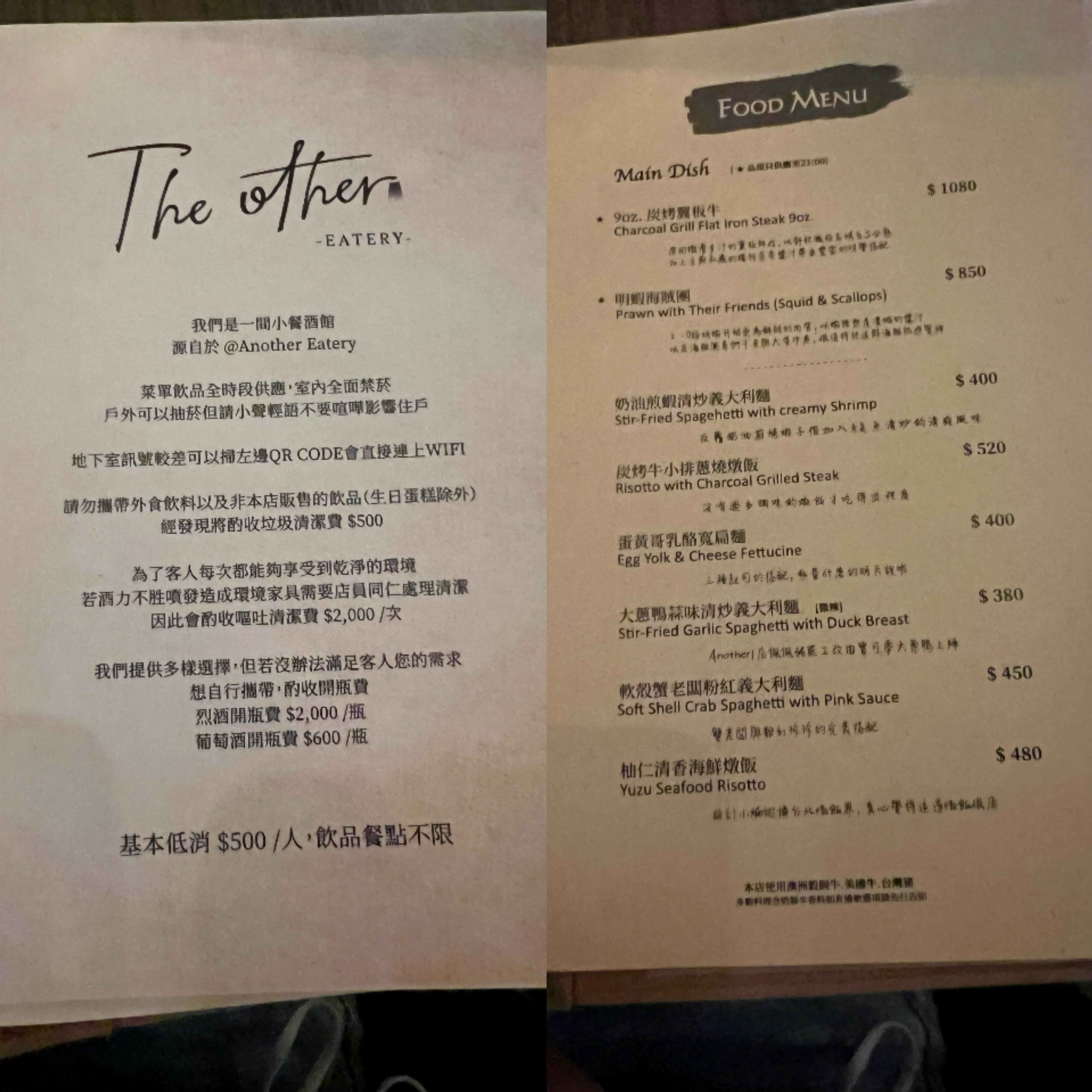 《 The Other Eatery 中山小酒館》 基本低消每人 500 元(飲品、餐點不限,他們家的菜單是 偏創意餐酒館風格,但價格不會太誇張(中山站來說算合理),雖然小小一間,但品項比想像中豐富。