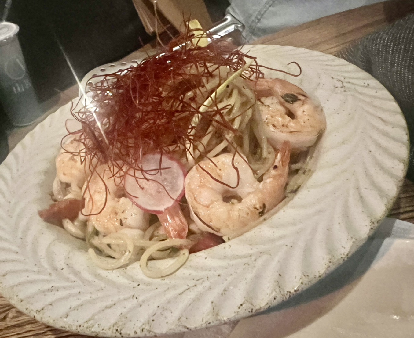 麵本身煮得偏彈牙,調味奶油香但不厚重,是清爽版的奶油義大利麵。蝦子香煎過,外層微脆、內層紮實,是整盤味道裡最亮眼的部分。