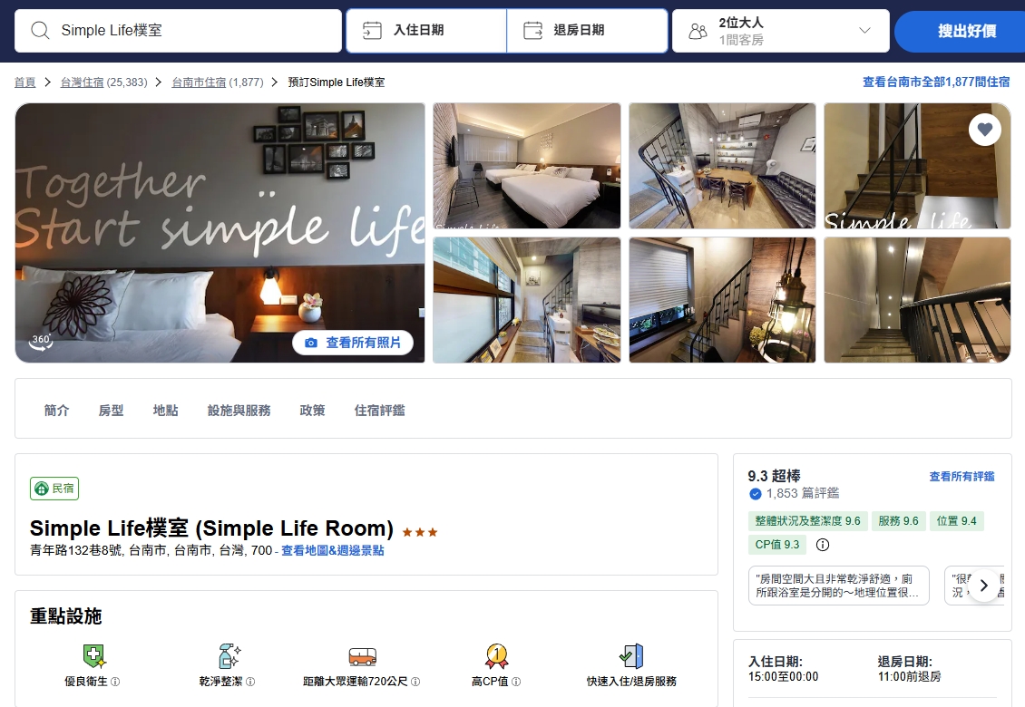 這次的台南小旅行,其實是在「 Agoda」 上無意間滑到《 Simple Life 樸室》。看到四人房平日一晚價格只要兩千初,實在有點驚訝。雖然我們是兩大一小同行,但比起雙人房,兩張雙人床的四人房在空間與睡眠品質上都舒服許多,再加上整體評價不錯,當下就直接下訂,沒有多想。