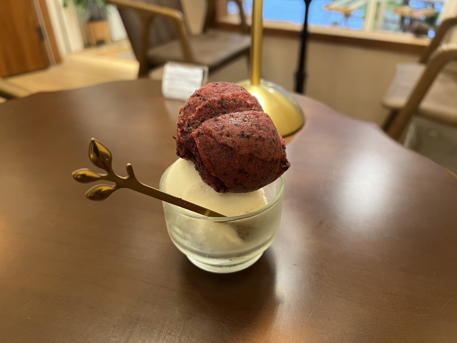 藍莓的酸甜很清爽,吃的到果肉的口感,香草則是溫潤滑順,兩個搭在一起很平衡,不會膩口。