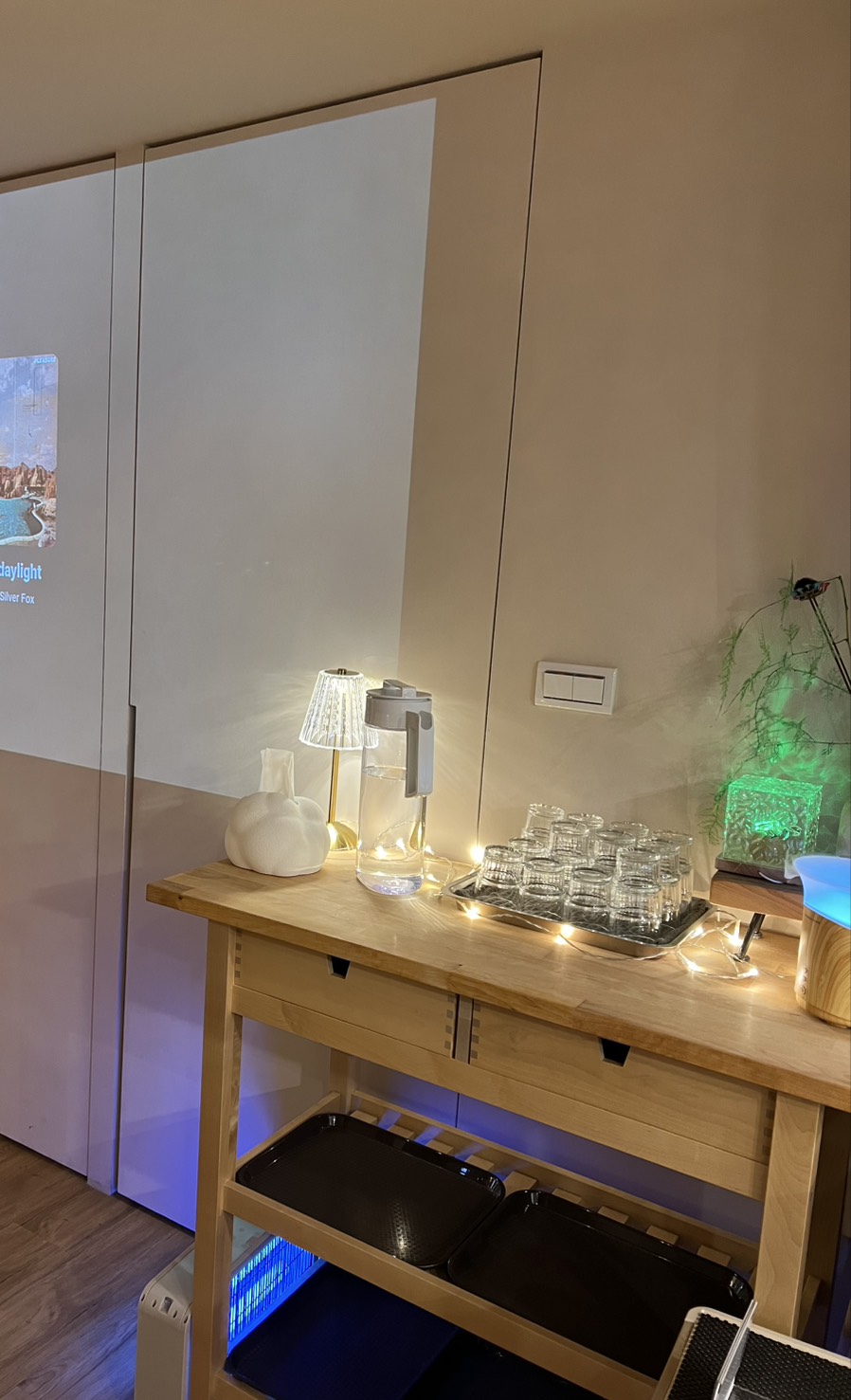 偏暗黃的燈光讓氣氛一下子就放鬆下來,牆上投影幕播放著音樂畫面,整體節奏很慢。雖然桌數不算爆多,但以 Gelato 店來說已經算是相當寬敞了,木頭桌椅質感很好,坐起來很舒服。另外也有戶外座位區,天氣好的時候坐在外面吃冰應該也很愜意。