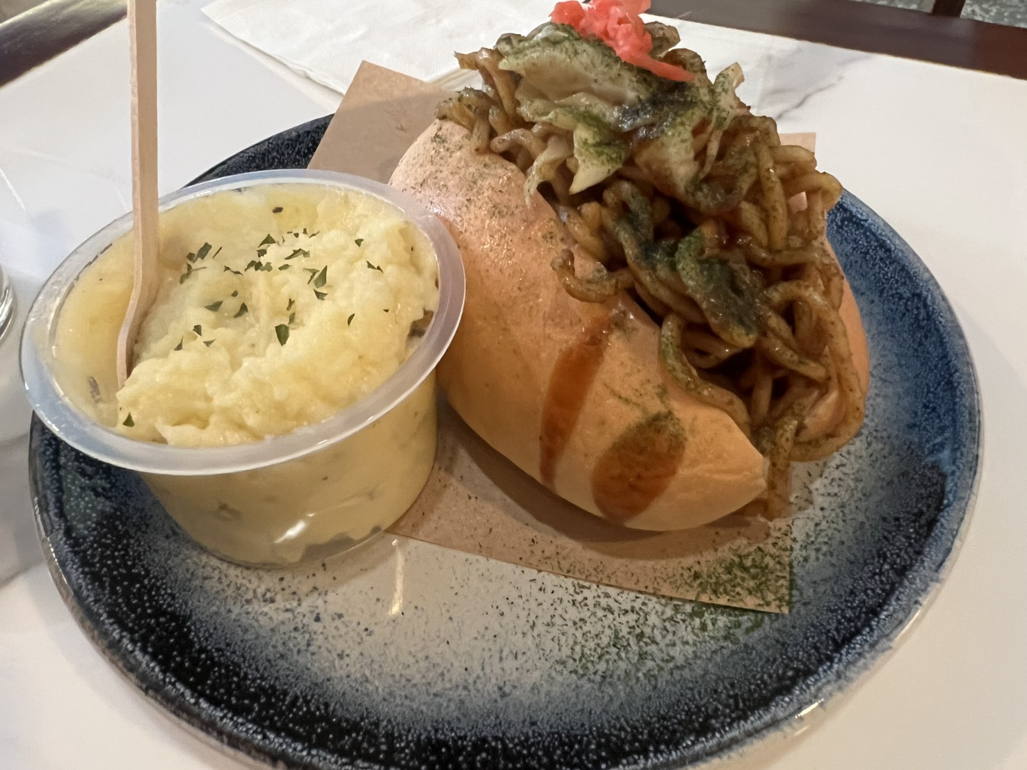 炒麵餐包一上桌就讓人聯想到日本的祭典攤位。餐包外層柔軟微甜,裡頭夾著鹹香的炒麵,醬汁收得剛好不會太濕。咬下去麵條彈牙、麵香和麵包香交融,搭配滑順綿密的薯泥一起吃,口感更豐富。