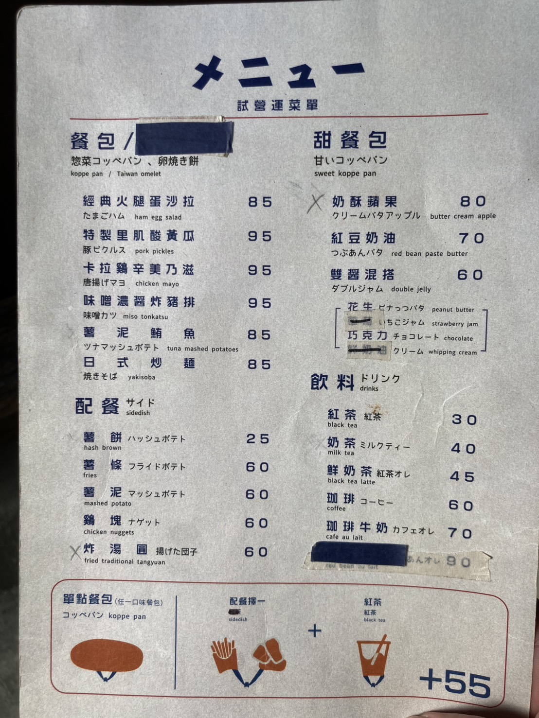 《桑斗早餐》的菜單簡單明瞭,主打日式餐包,可選擇鹹或甜的搭配組合,另外還有幾款炸物點心與飲品。份量不大,適合不想吃太撐的早晨。