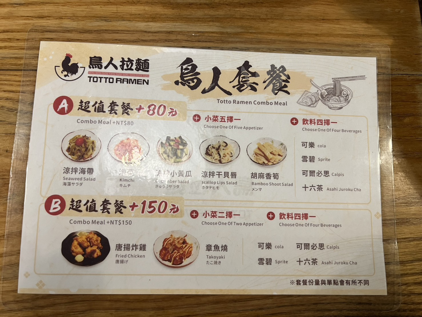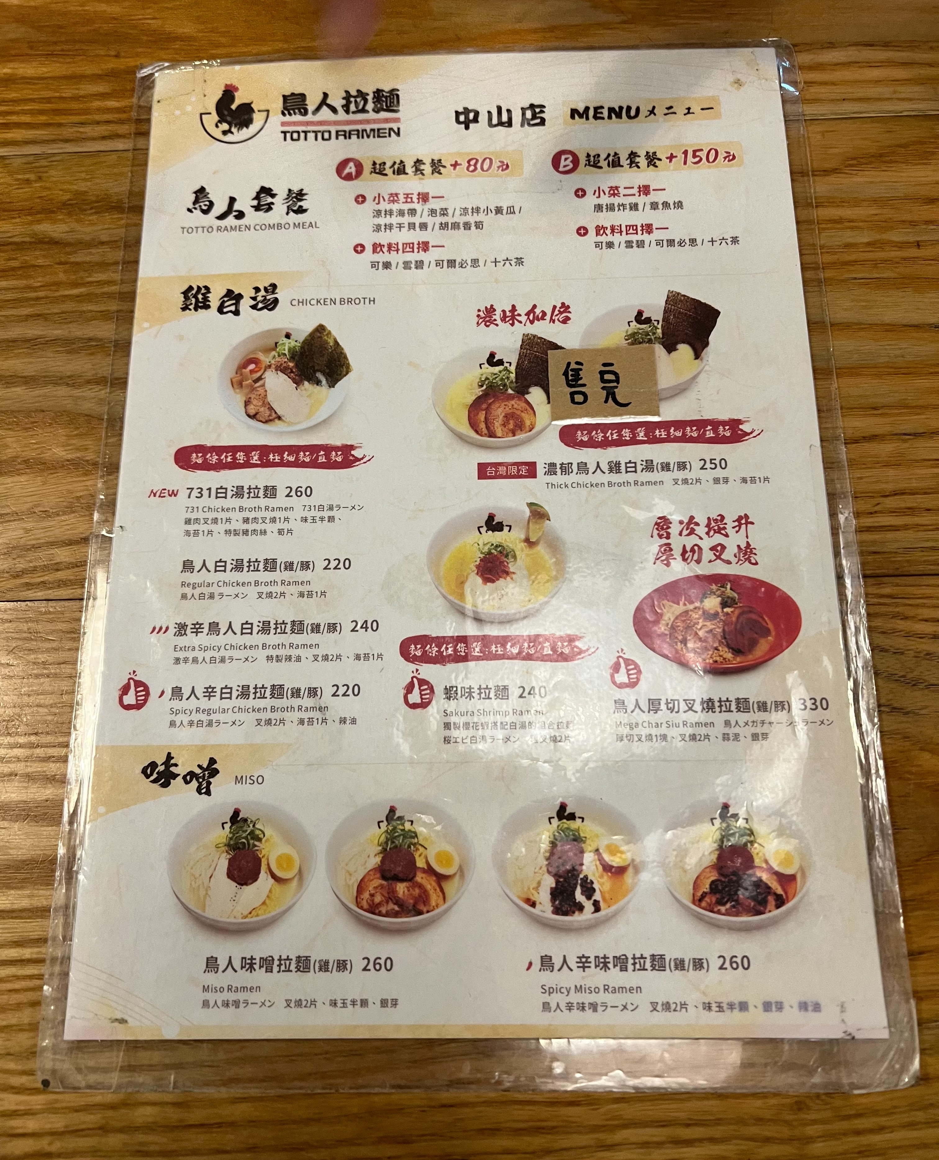 《鳥人拉麵 Totto Ramen》拉麵平均價格落在 $220~$260 左右,也有升級套餐可以搭配小菜或飲品,整體來說價位合理。