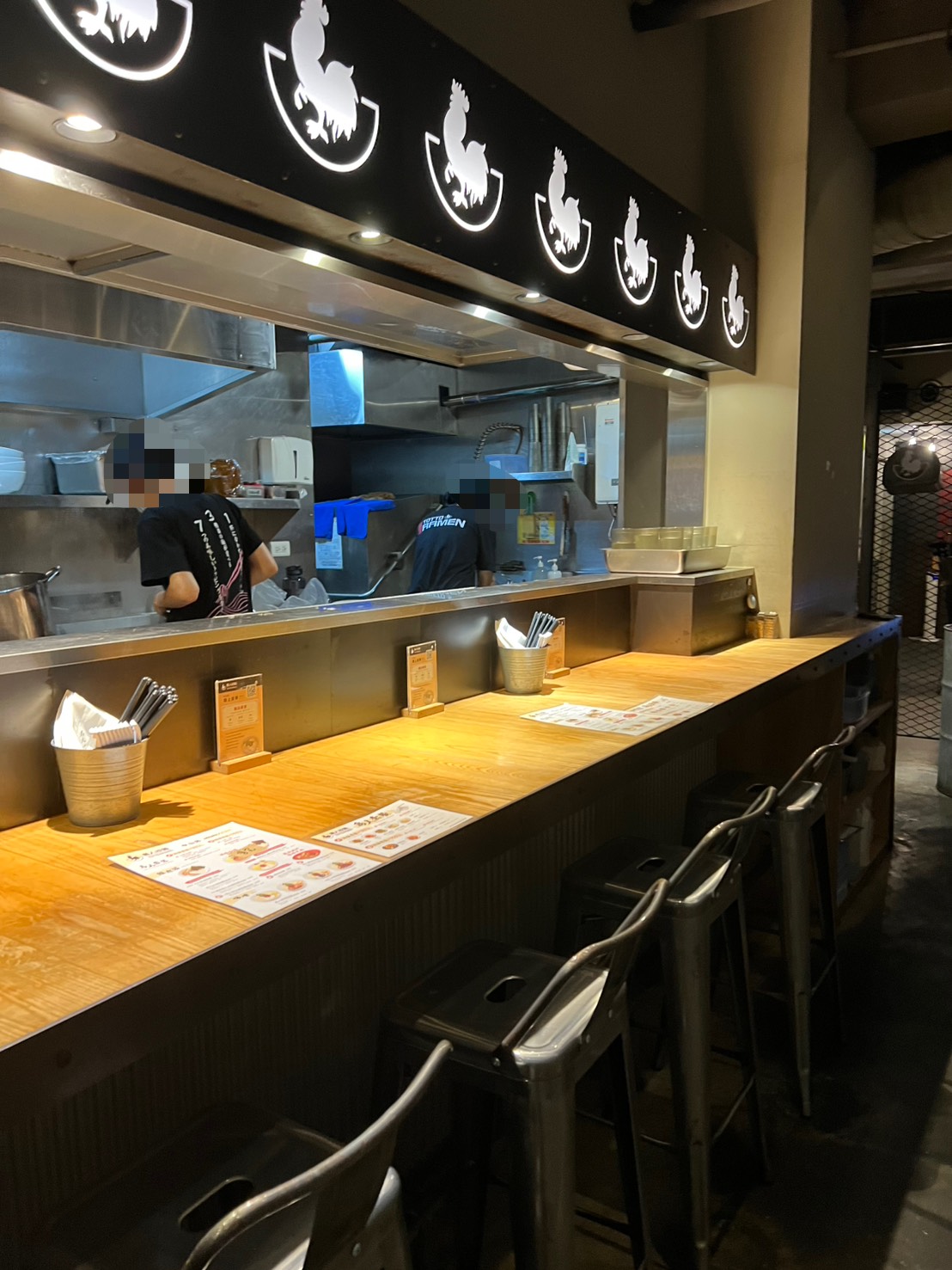 店面位於巷弄內,空間不大,大多是高腳椅與金屬桌椅的配置,整體是偏工業風的木質調設計,牆上有明顯的公雞 Logo,辨識度很高。氣氛有點像紐約街角小食堂,簡單但乾淨明亮。