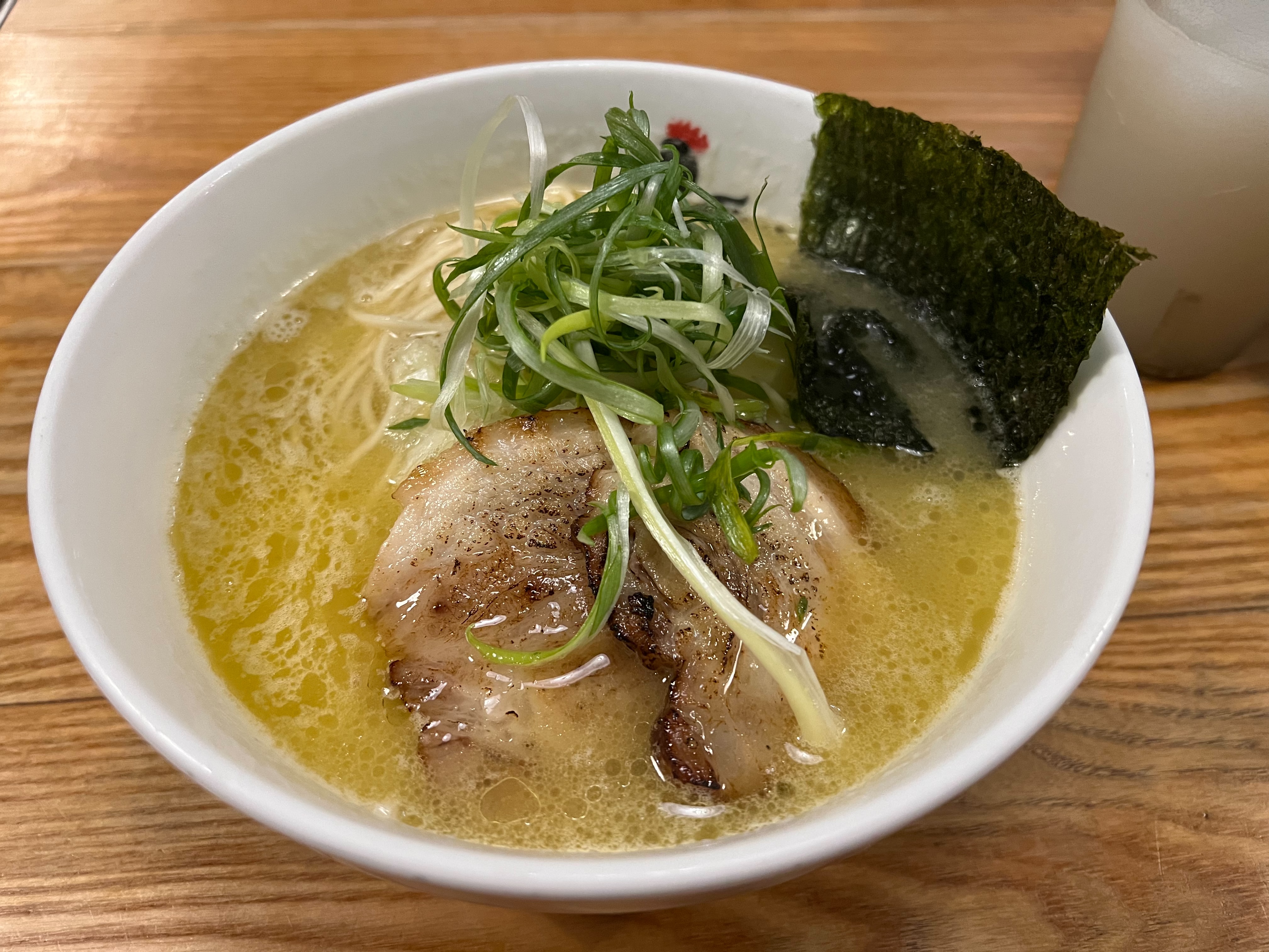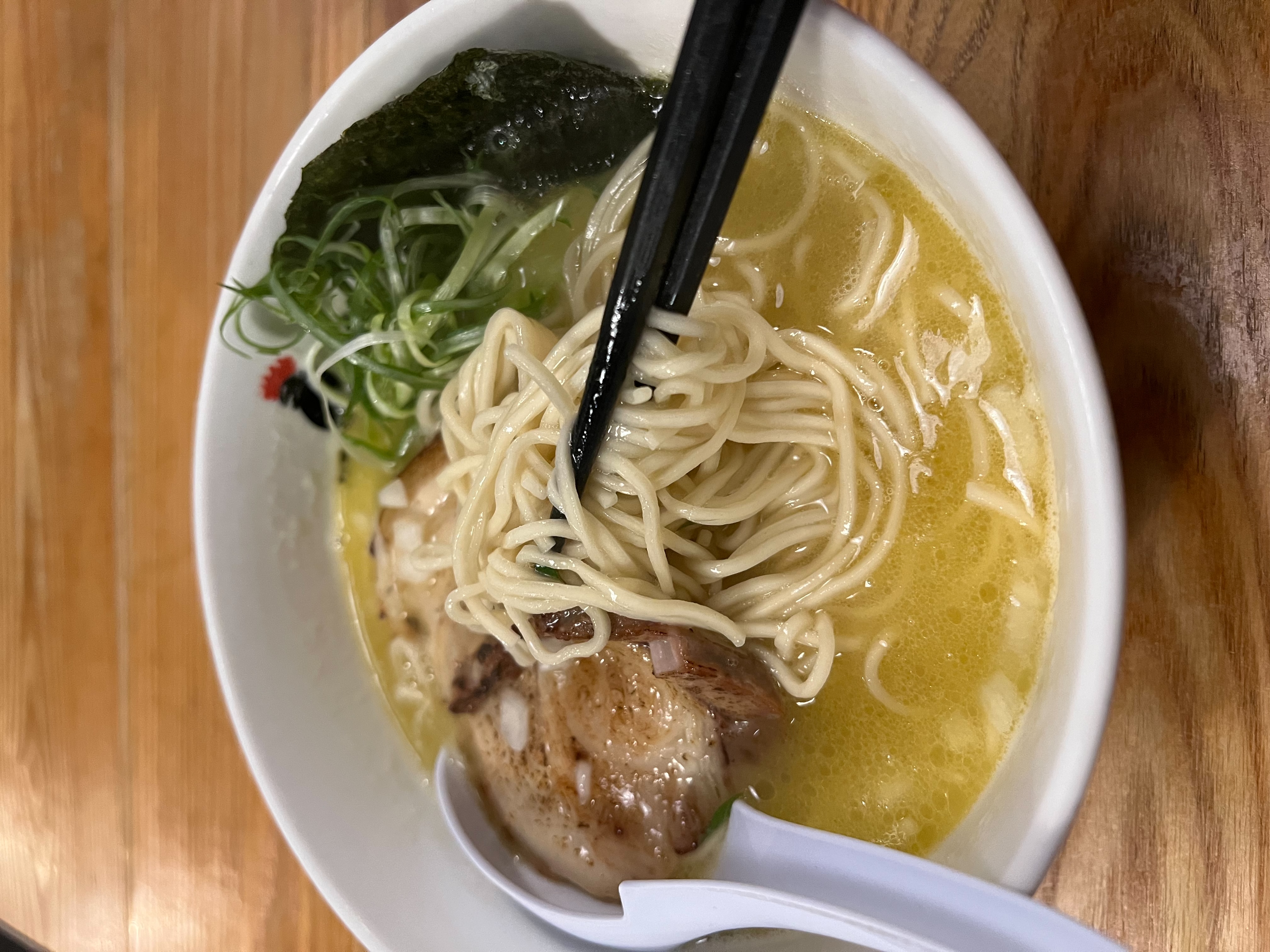 湯頭屬於柔滑型的雞白湯,入口帶點濃郁油香但不會膩,鹹度偏中,喝起來順口。叉燒厚度剛好,帶一點炙烤香氣,搭配細麵與蔥絲,整體平衡。屬於「不會讓人驚呼、但很穩定」的味道。