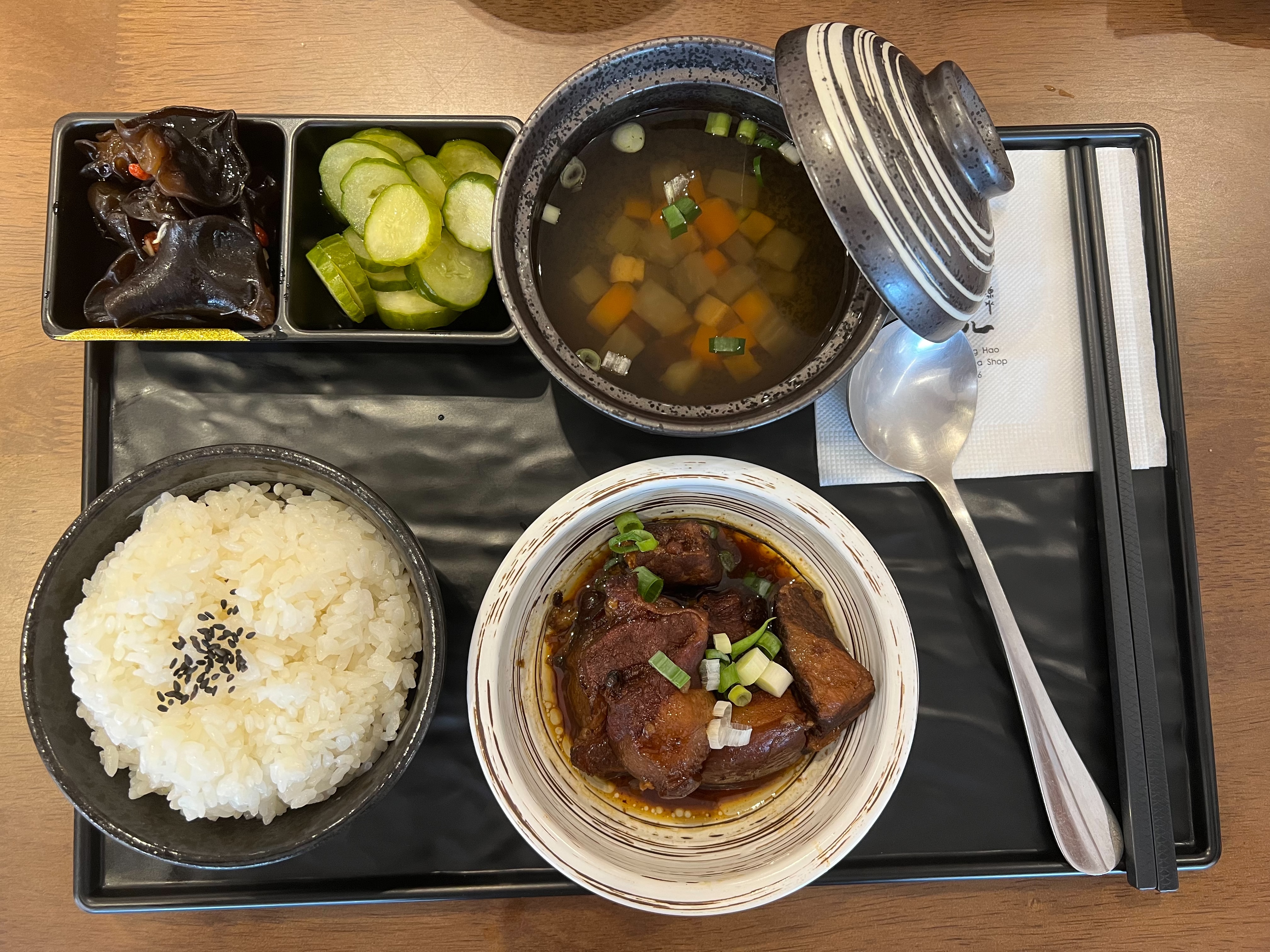 一份餐包含紅燒肉、一碗飯、涼拌小黃瓜、黑木耳,還有一碗清爽紅蘿蔔湯。紅燒肉滷得入味,肥瘦比例剛剛好,鹹香中帶點甜味,配飯完全無敵。小菜和湯則是走清爽系,吃起來很有均衡感。