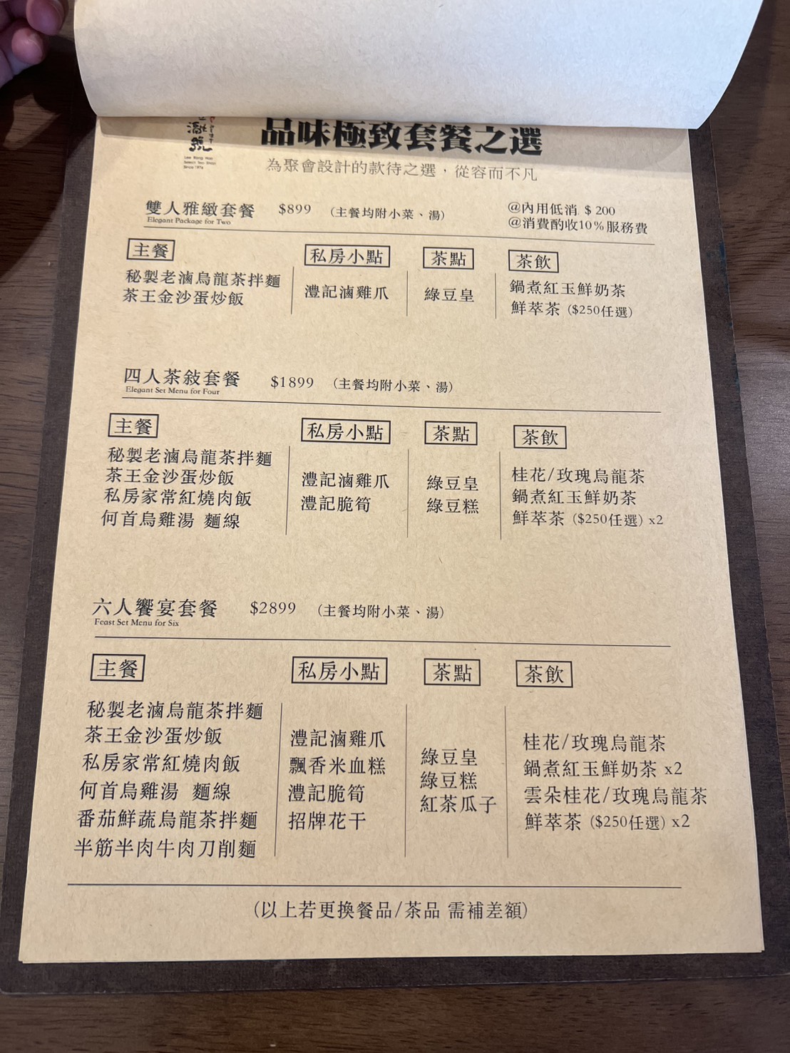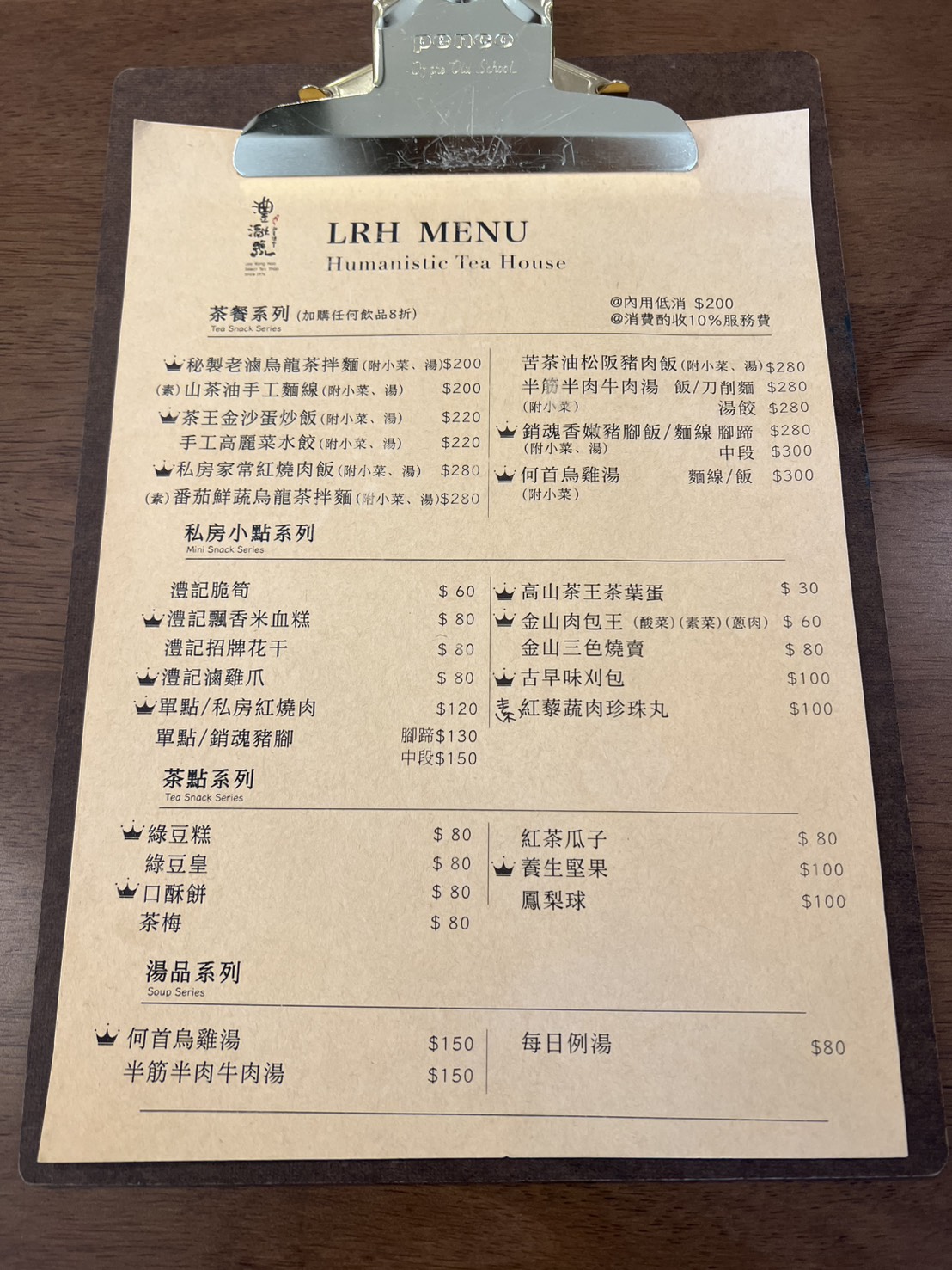 《澧瀜號》的特色是 不只喝茶,還能吃飯!餐點以台式定食為主,像是山茶油手工麵線、紅燒肉飯、水餃等等,價位大約在 $250 左右。除了主餐,也有小點心、茶點可以搭配茶飲,選擇算是相當多元。
