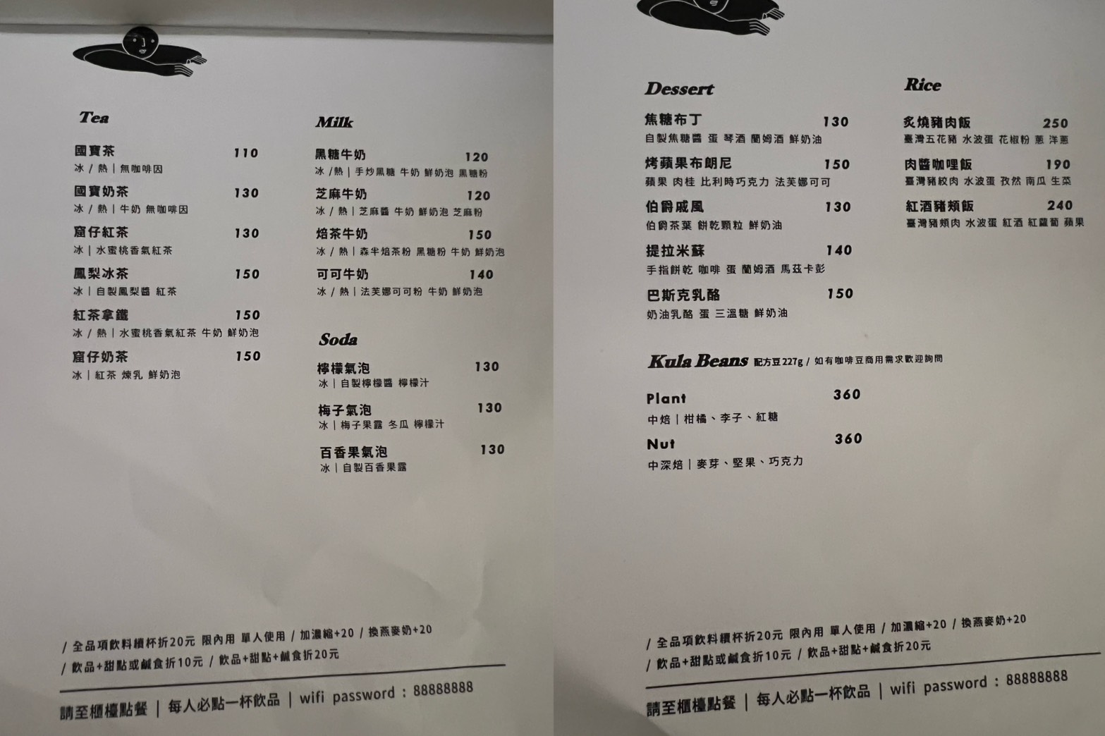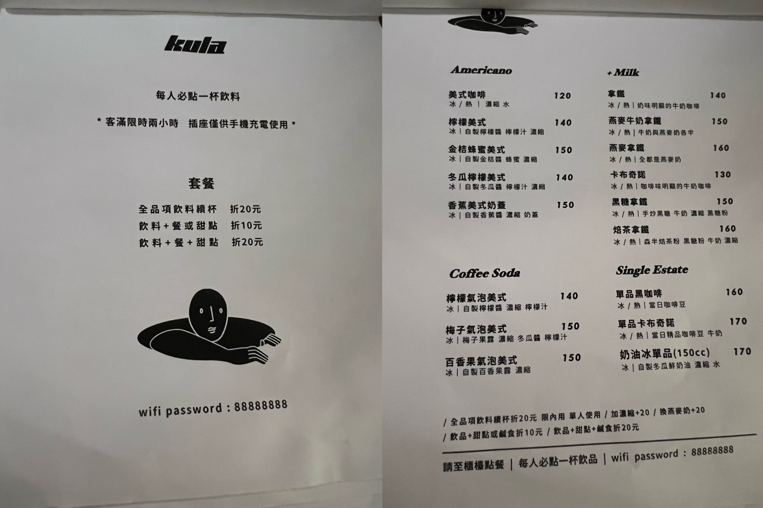 《 Kula 咖啡》的飲品選擇很多,除了咖啡,也有各式奶茶、茶飲。比較特別、也是我們選擇它的原因,是 這裡不只有甜點,還有正餐可以吃,對晚上想找「可以吃飽的咖啡廳」來說非常重要。低消 一杯飲料,如果有點正餐,搭配飲品其實滿剛好的。