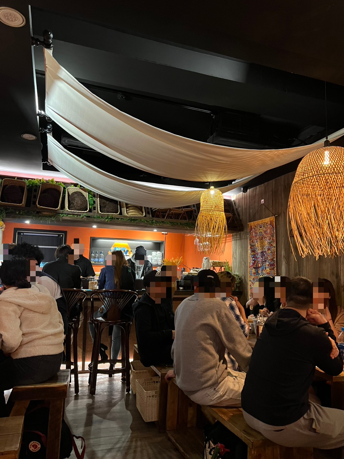 《Tiny Tai泰式串燒》整體餐廳空間並不是太大,店內利用橘色調牆面,搭配許多很有泰式南洋風格裝飾與燈物點綴,整體空間既放鬆又有設計感。