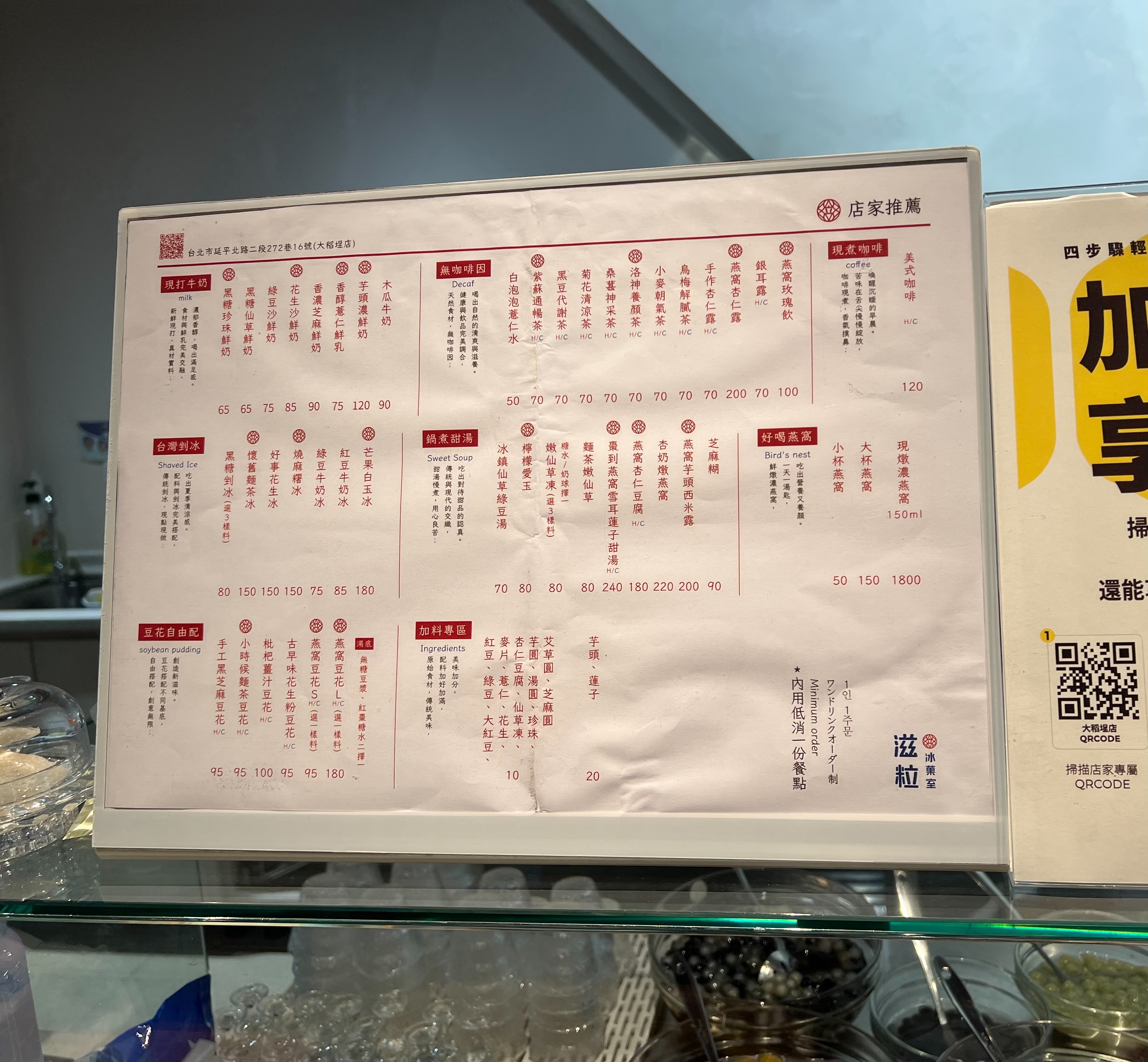 後來才知道,《滋粒冰菓室》其實是燕窩品牌公司開的冰品店,創始店在台北永康商圈,這間大稻埕分店算是第二間,難怪整體氛圍和外觀都很有設計感。